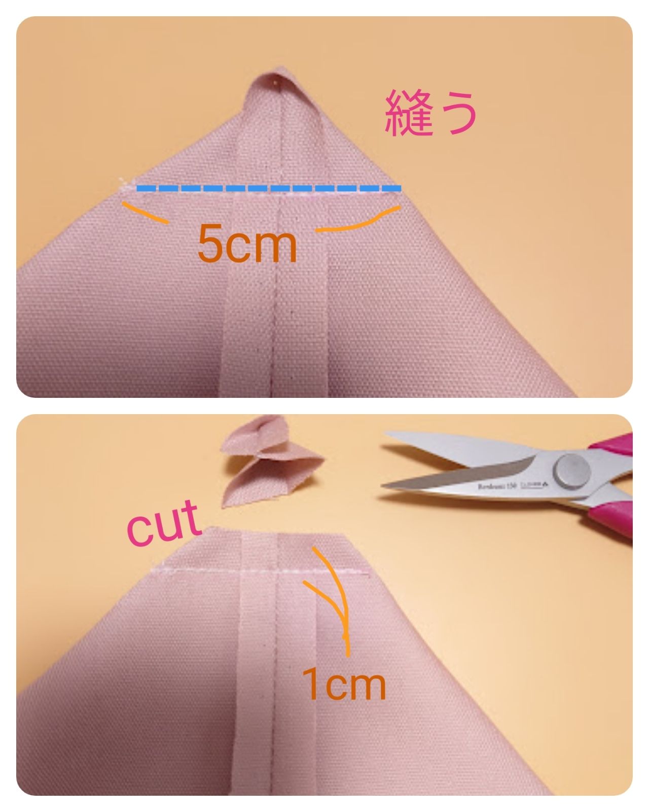 ⑥マチ5cmを縫い、縫い代1cm残して切り落とします。もう片方も同じように作ります。