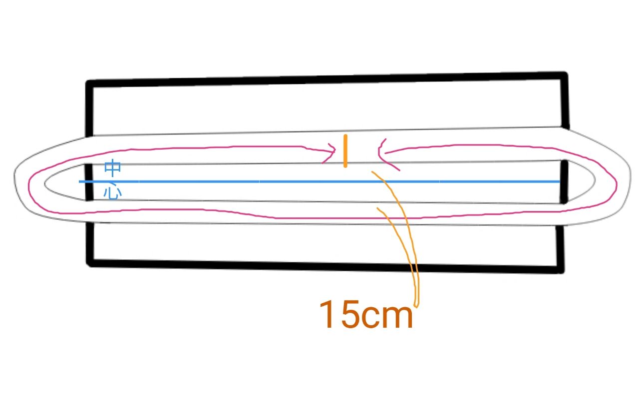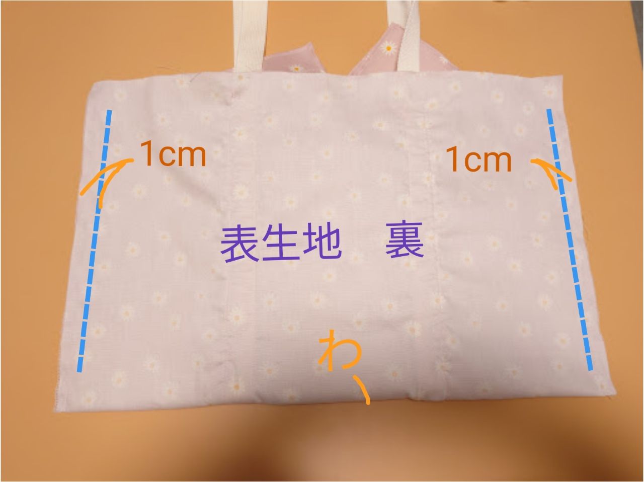 ⑤表本体を、底を輪に二つ折りにして、両サイドを縫い代1cmで縫います。