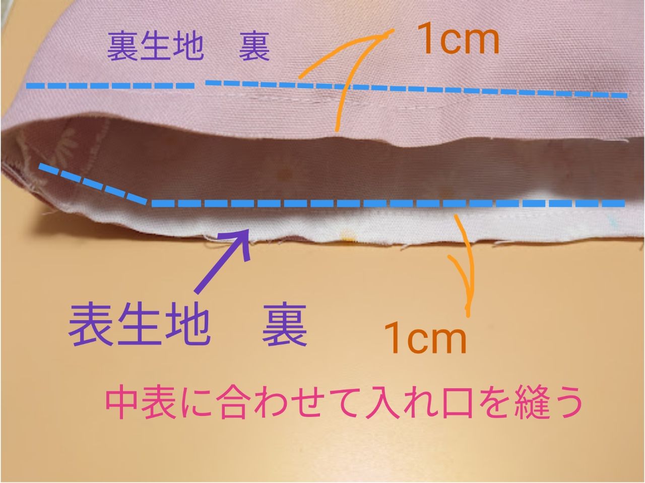 ⑨表本体と裏本体を中表に合わせて、入れ口を縫い代1cmで縫います。