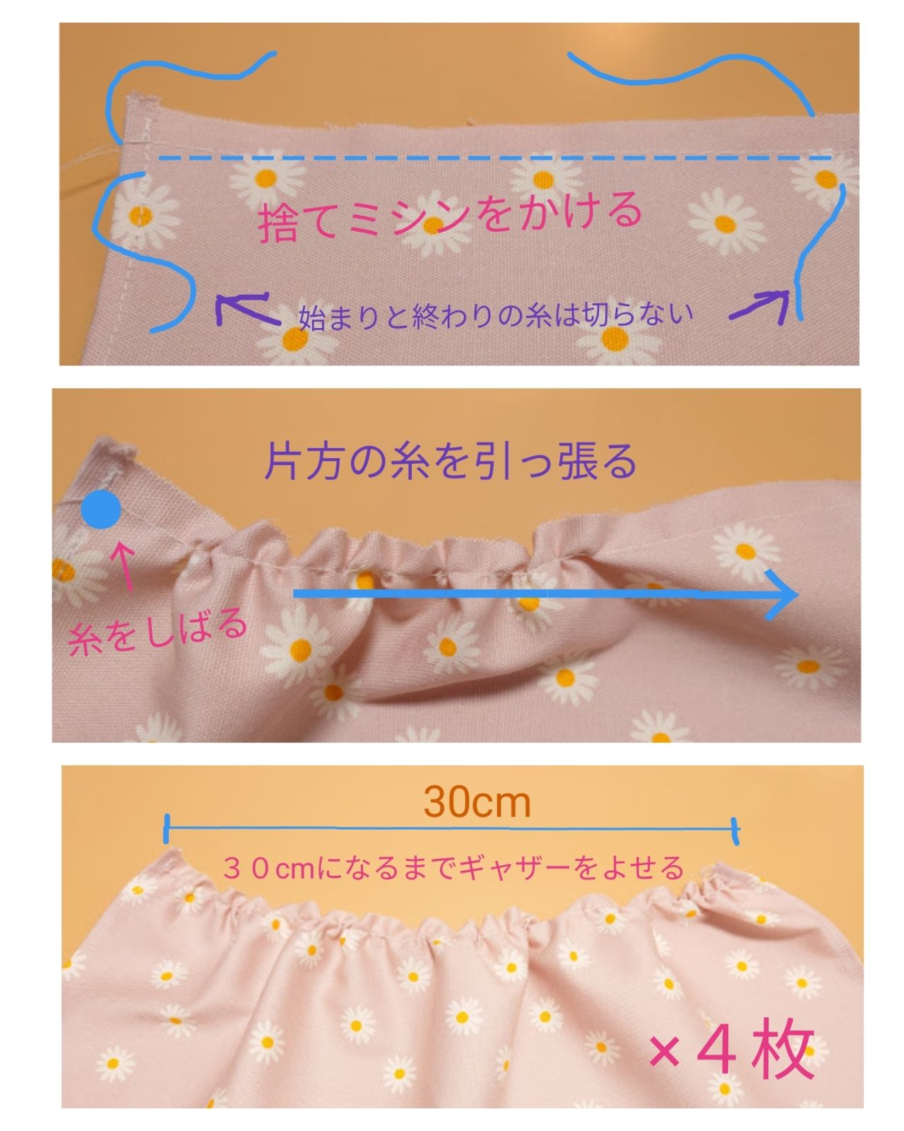 ②ギャザーを寄せます。
