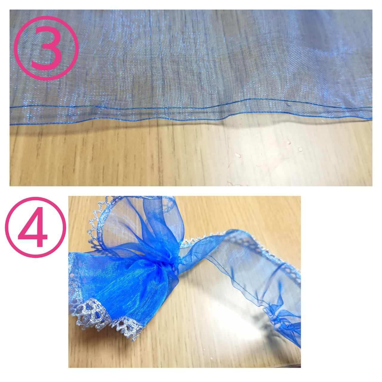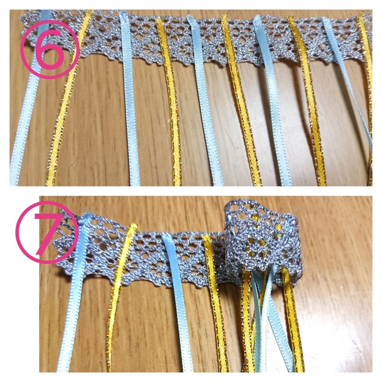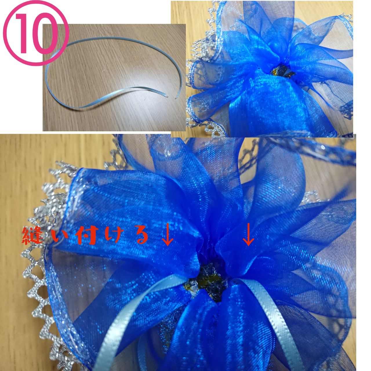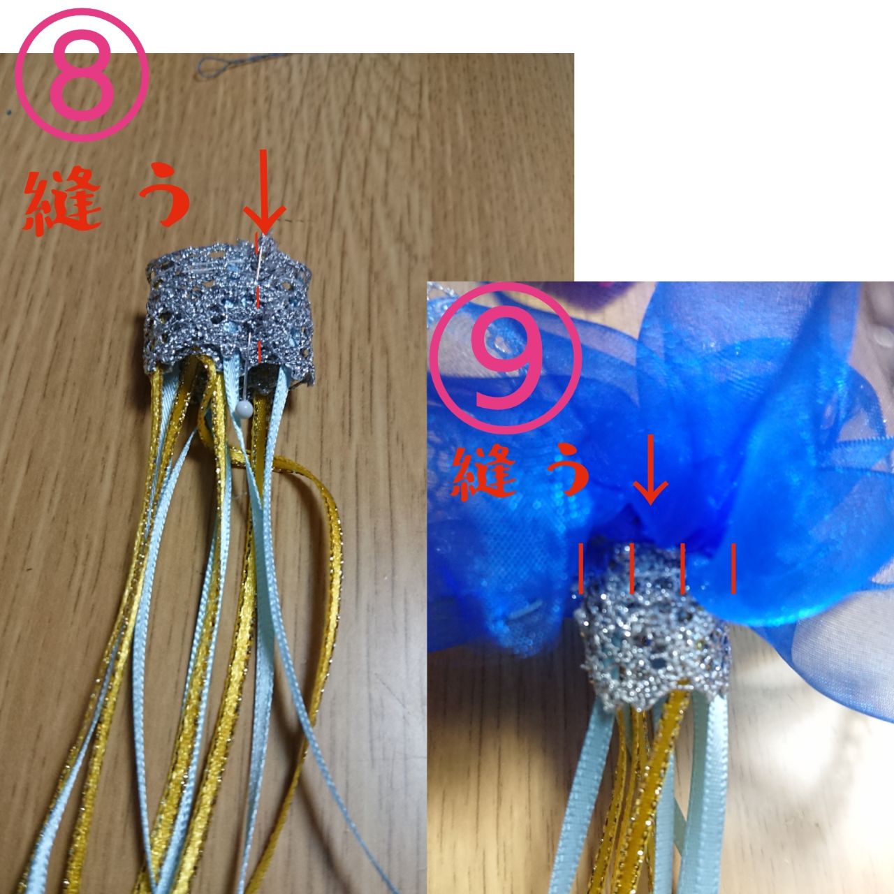 幅3ミリのサテンリボン40センチを⑨で作成したものに縫い付けます→完成!
