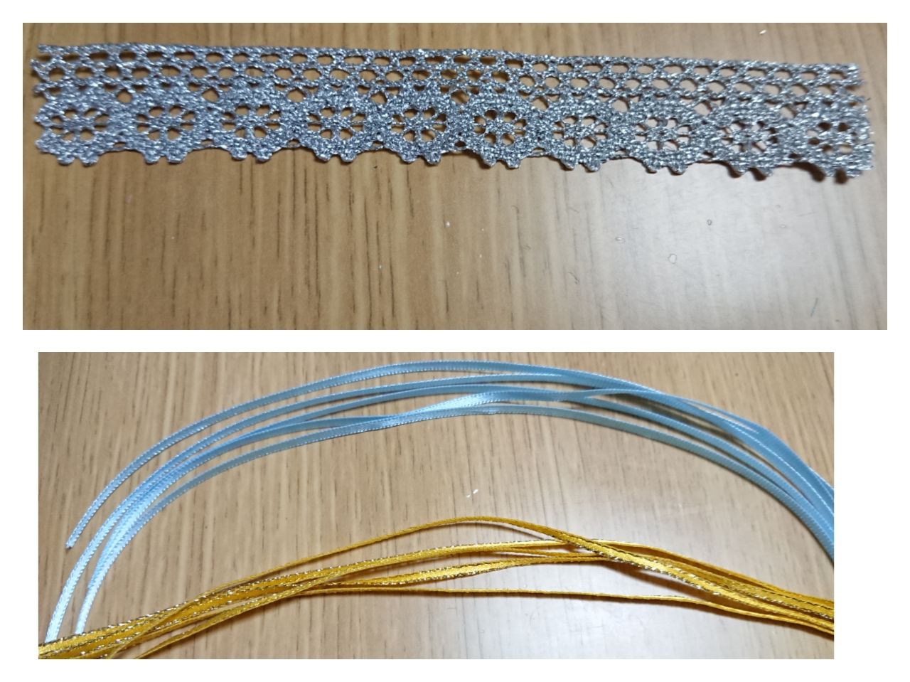 25センチのリボンを10センチのレースに縫い付けていきます。