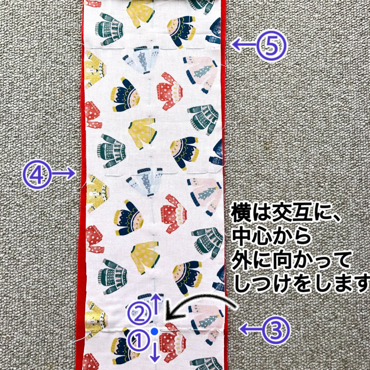 図の番号の手順で行うと布にたるみが起きにくくなりますのでお試しください。