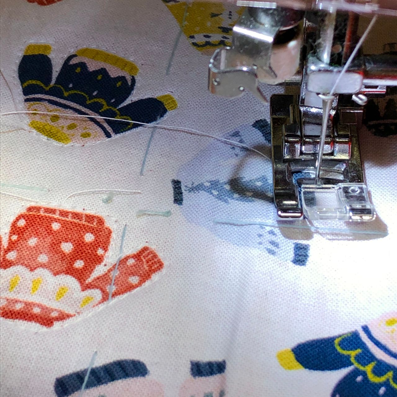 まずは柄の生地とフェルト生地を重ねてずれないようにしつけをします。