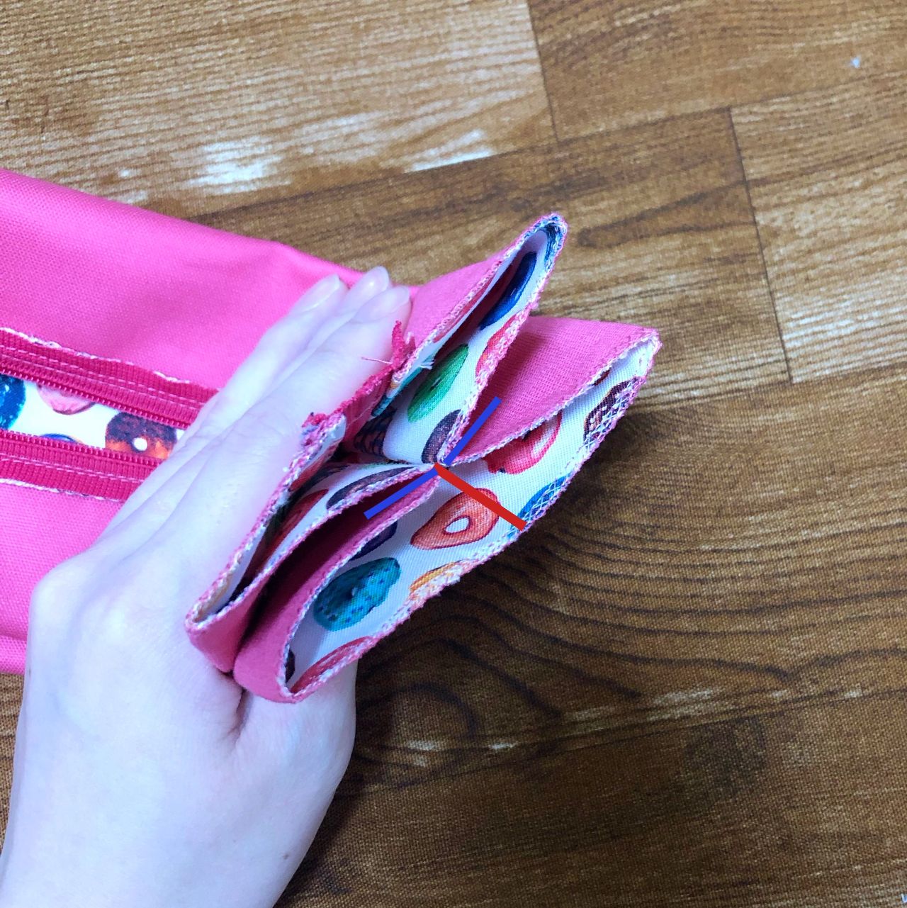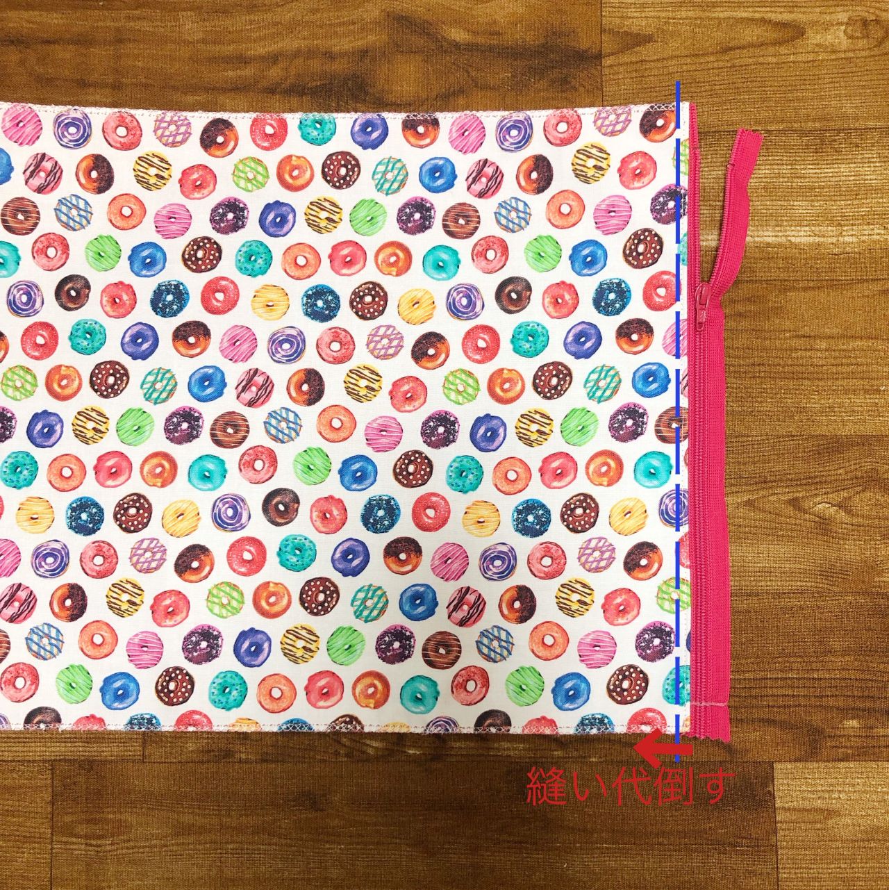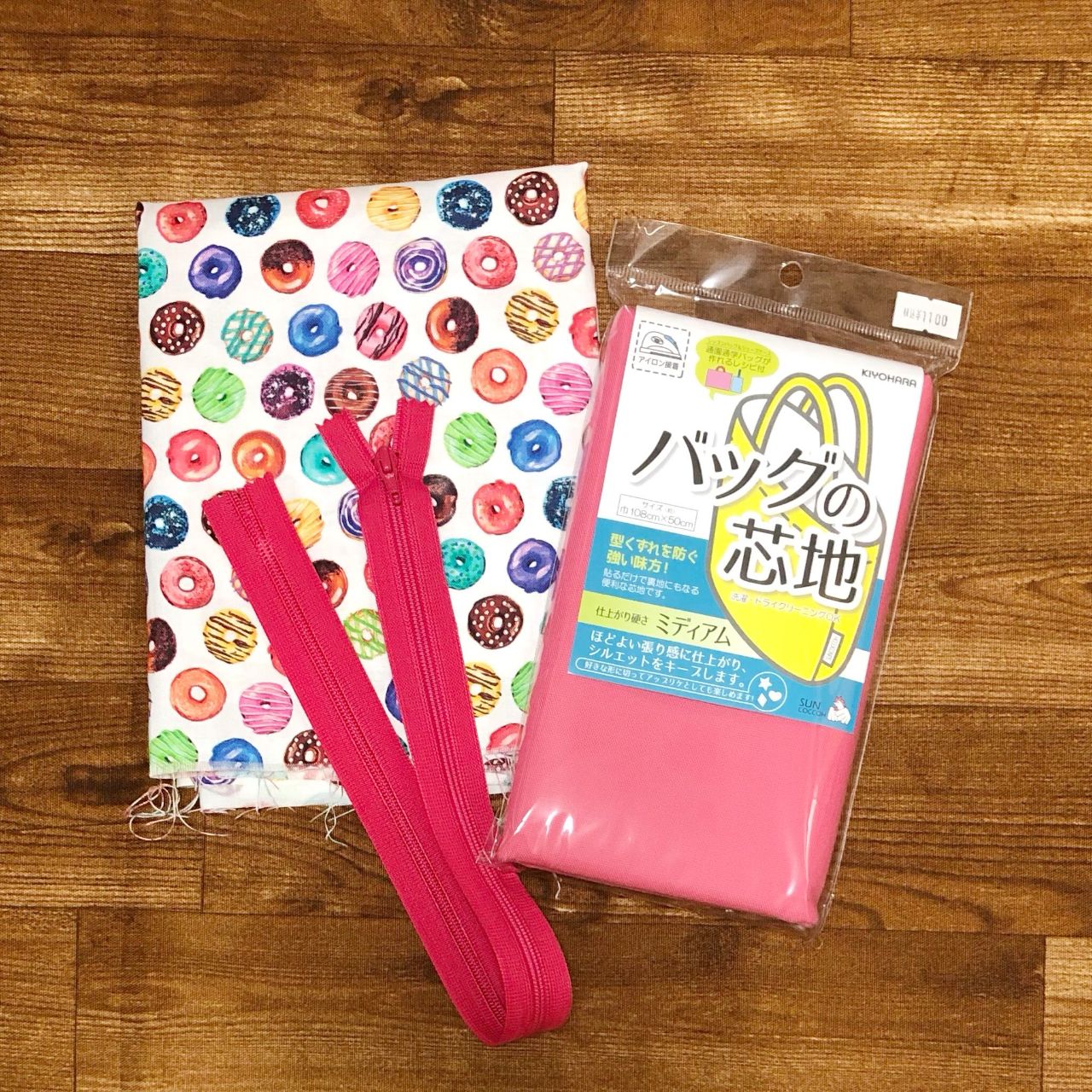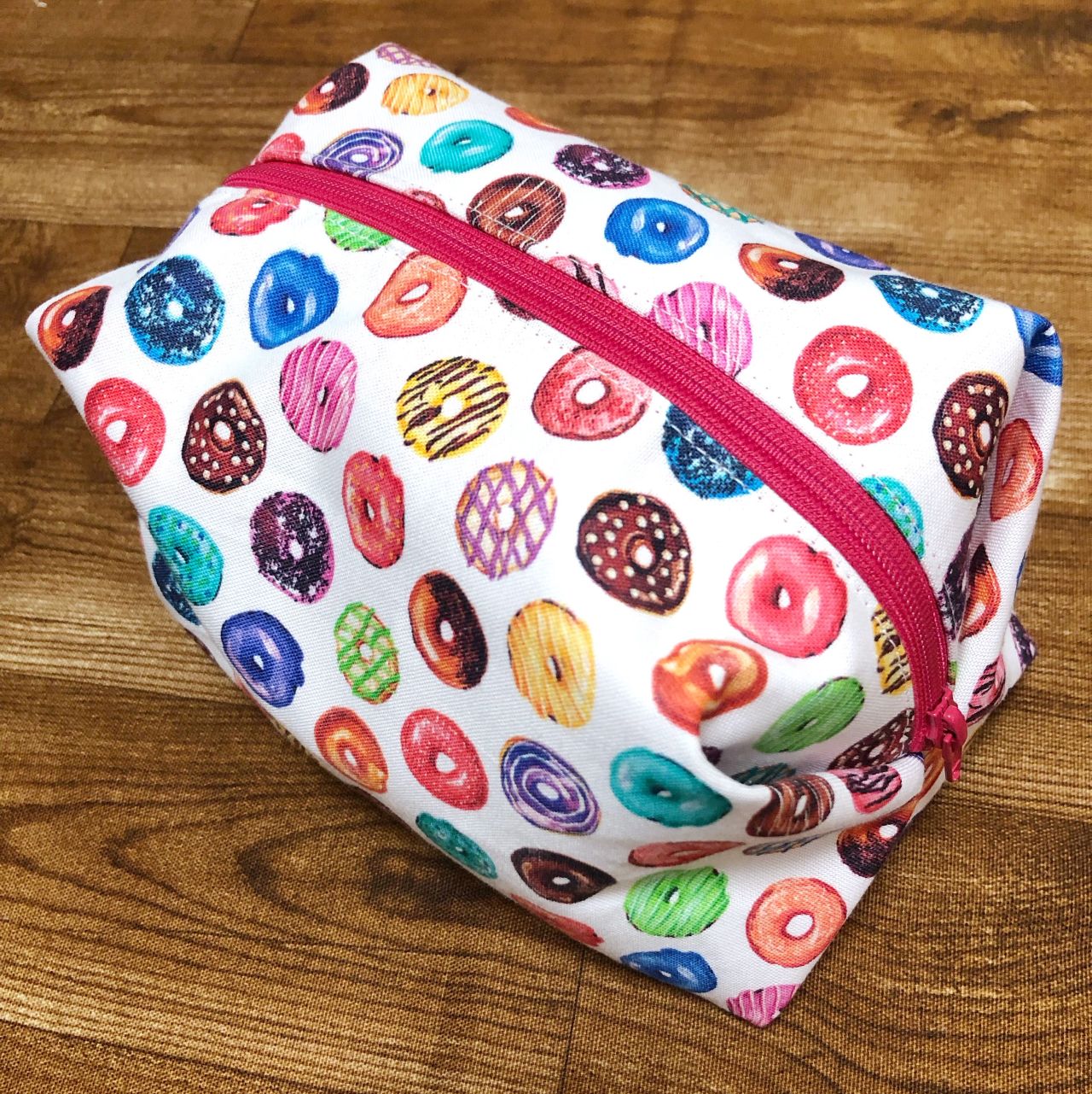 今回は先日店舗に入荷致しました、ポップな色合いがかわいい!ドーナツ柄の生地を使ってキャラメルポーチを作成したのでご紹介します♪